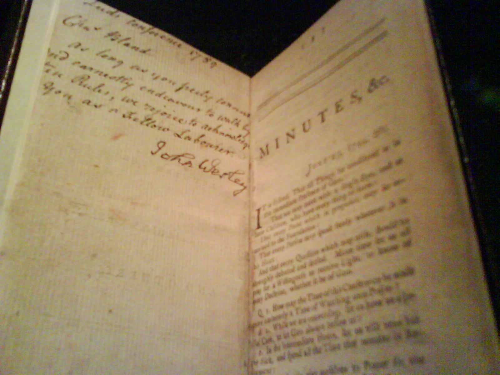 Bridwell also has a copy of the Minutes that was given to a “fellow laborer” which was, I believe, the practice for itinerant preachers, they were given a copy of the minutes with an inscription like the one pictured, signed by John Wesley. This one is dated 1789, so Wesley would have been about 86. Here is a picture of the Minutes signed by Wesley: