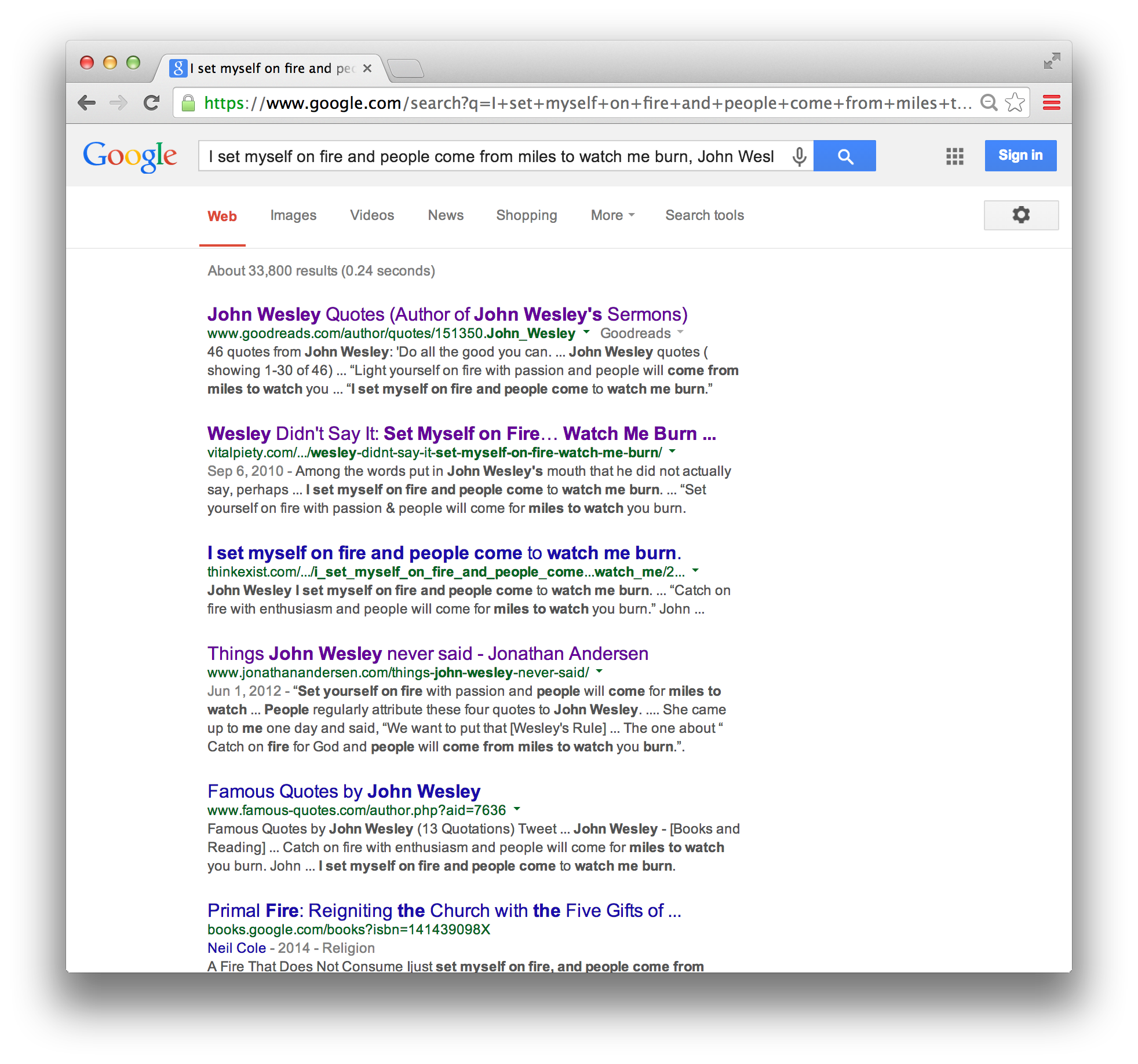 Remember that winning is not finding any webpage that attributes the quote to Wesley. In the image search, the Wikiquote page is good because it has an actual citation to a scholarly edition of Wesley’s letters. You can also use the date of the letter to look up the letter in the Telford edition of Wesley’s letters, which is currently the most comprehensive scholarly edition of Wesley’s letters. So, you win! Wesley did say that.