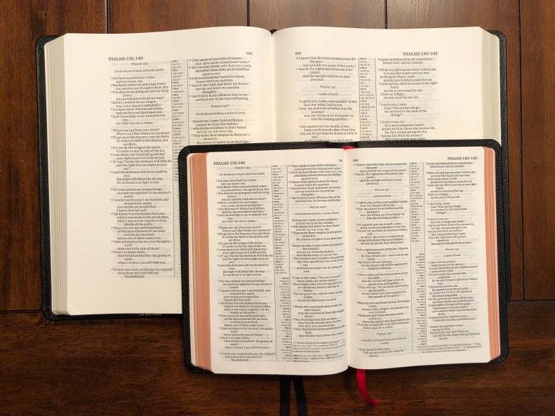As is obvious from the name, the Wide Margin is quite a bit larger than the Pitt Minion. The decrease in portability brings the benefits of larger text, the most expansive concordance I’ve seen in an NIV reference Bible, and room to write in the Bible.
