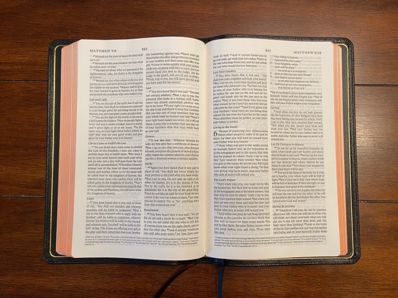 I carried a less expensive version of the slimline Bible when I travelled. Given its size it was easy to pull out of a backpack and read. The opportunities to witness grow significantly when you read a Bible in public.