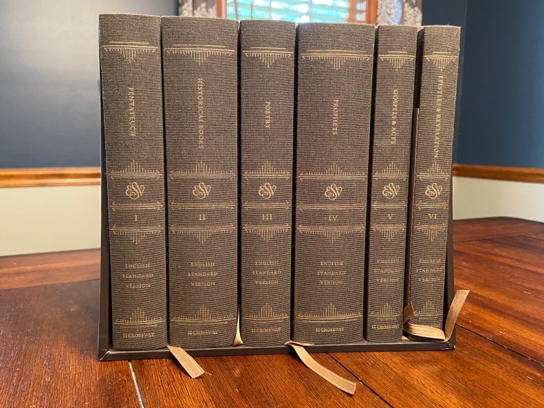 Crossway has impressed me with their thorough support for the ESV across the board. In addition to their Heirloom line, they also have creatively and thoughtfully produced a variety of Bibles. Outside of the Heirloom Bibles, my favorite is easily the ESV Reader’s Bible, Six-Volume Set.